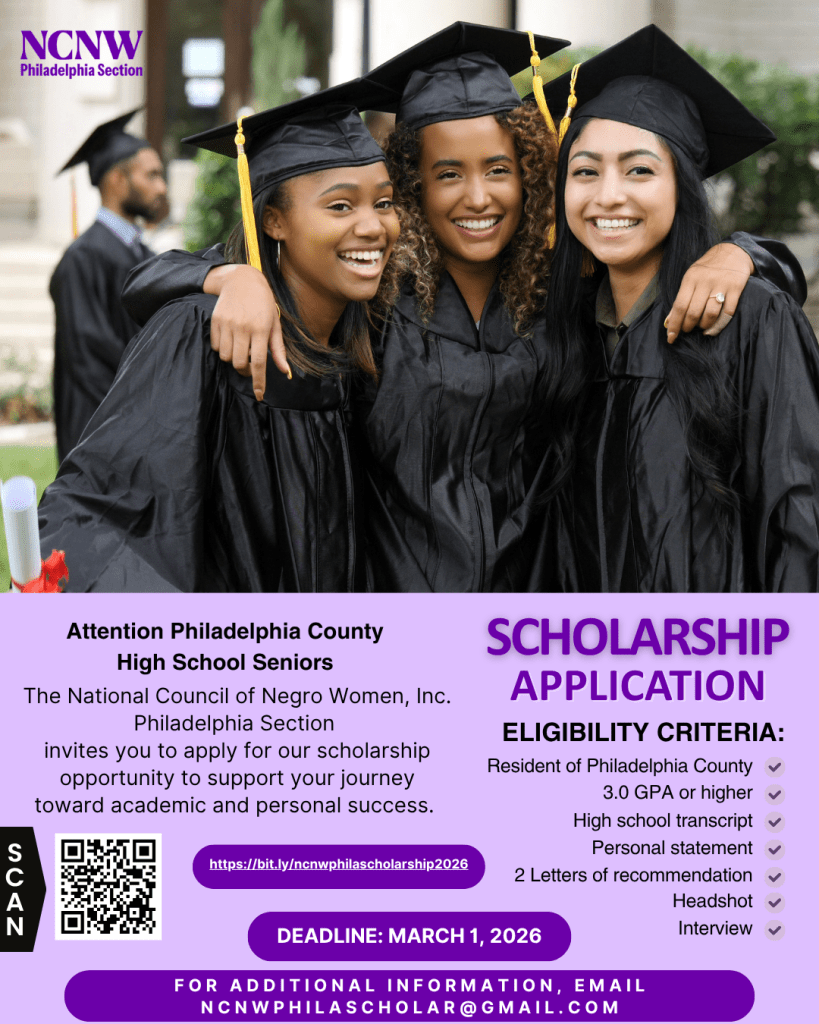 Each year, the NCNW Philadelphia Section Scholarship is open to a graduating senior attending a Philadelphia County high school and meet the following criteria: